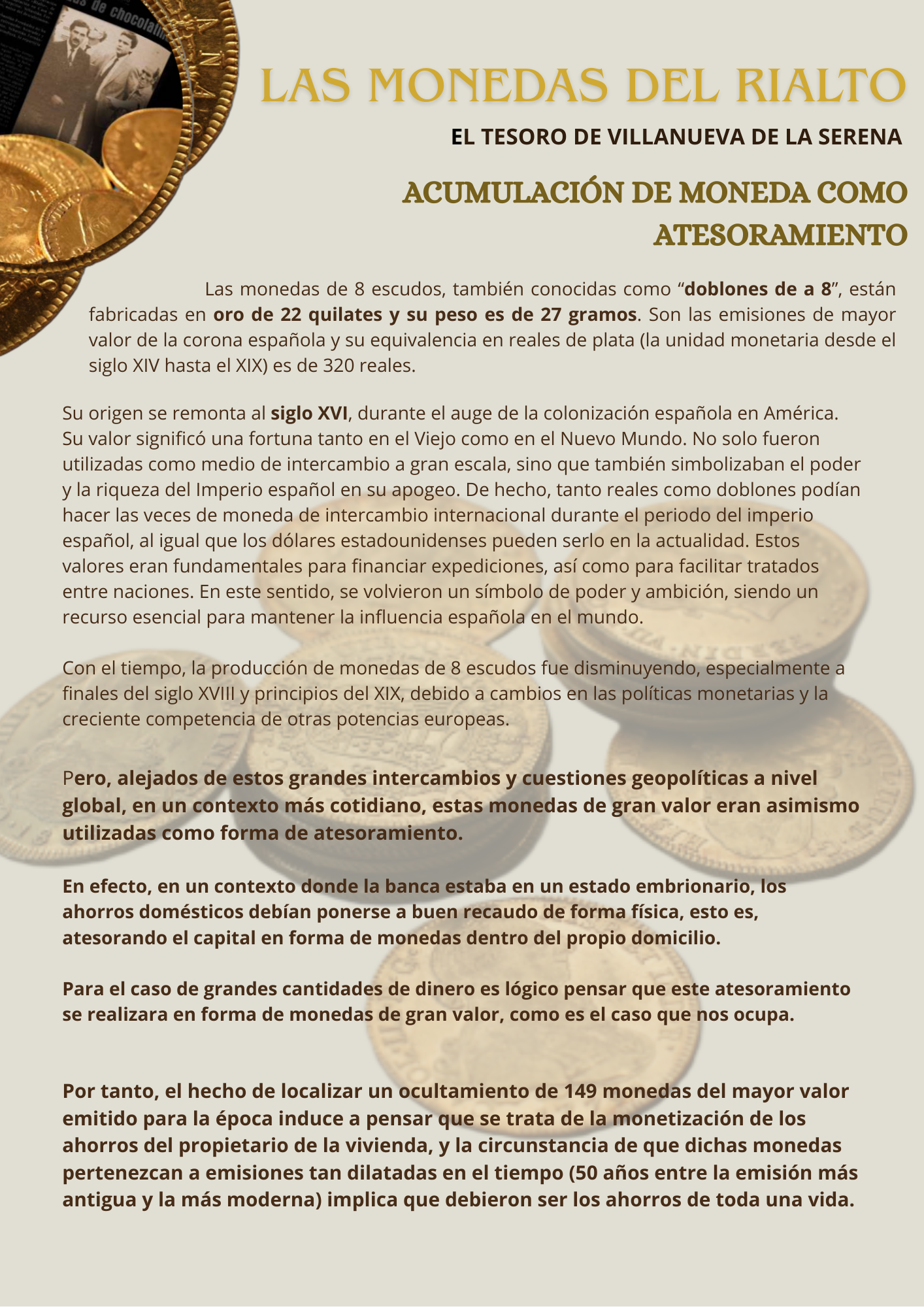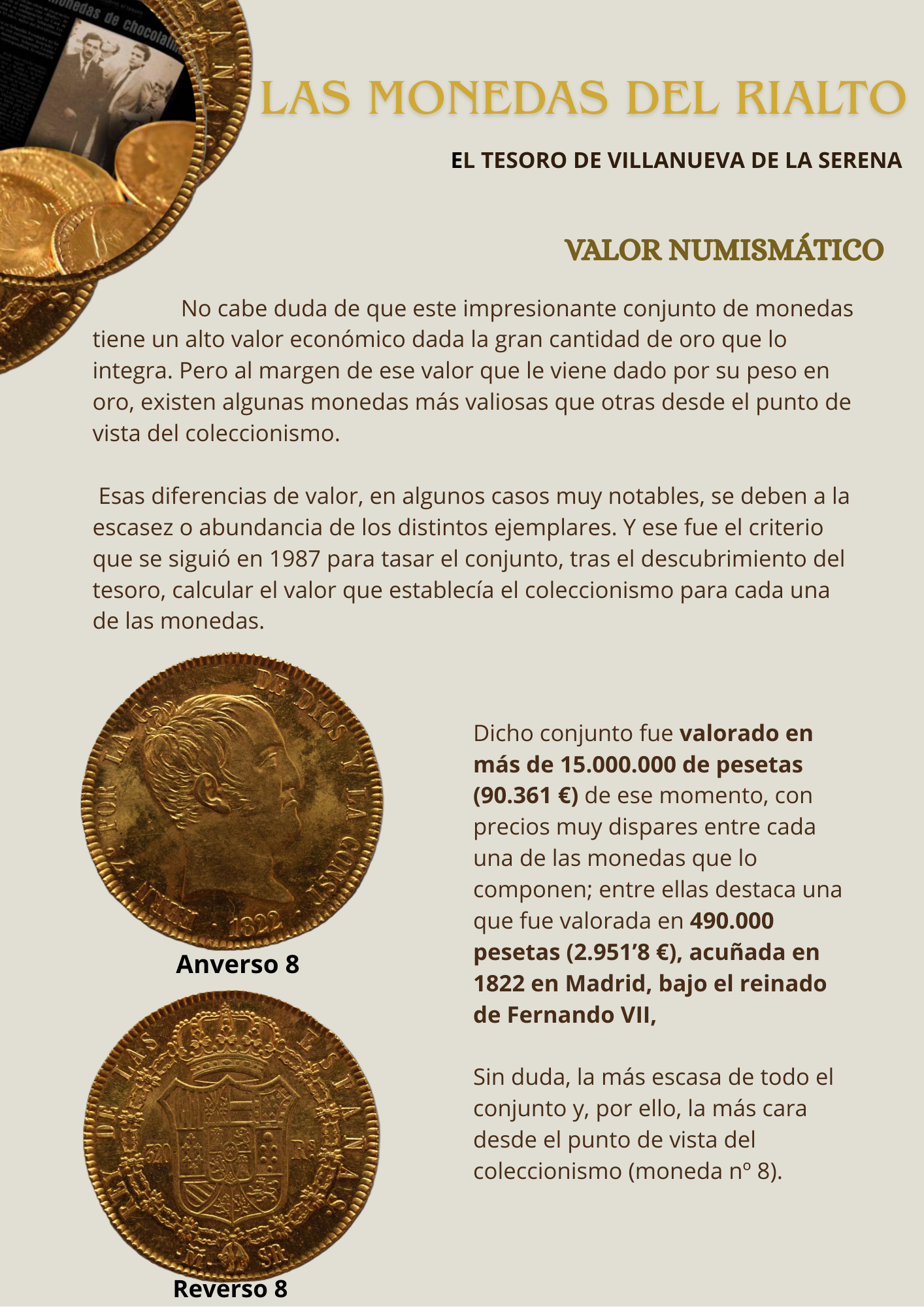 En los siguientes enlaces podrás ampliar la información sobre esta interesante exposición. Muchas de las curiosidades que envuelven a este hallazgo arqueológico que representa un auténtico Tesoro. Curiosidades y detalles numismáticos que puedes observar en las monedas del Tesoro de Rialto.